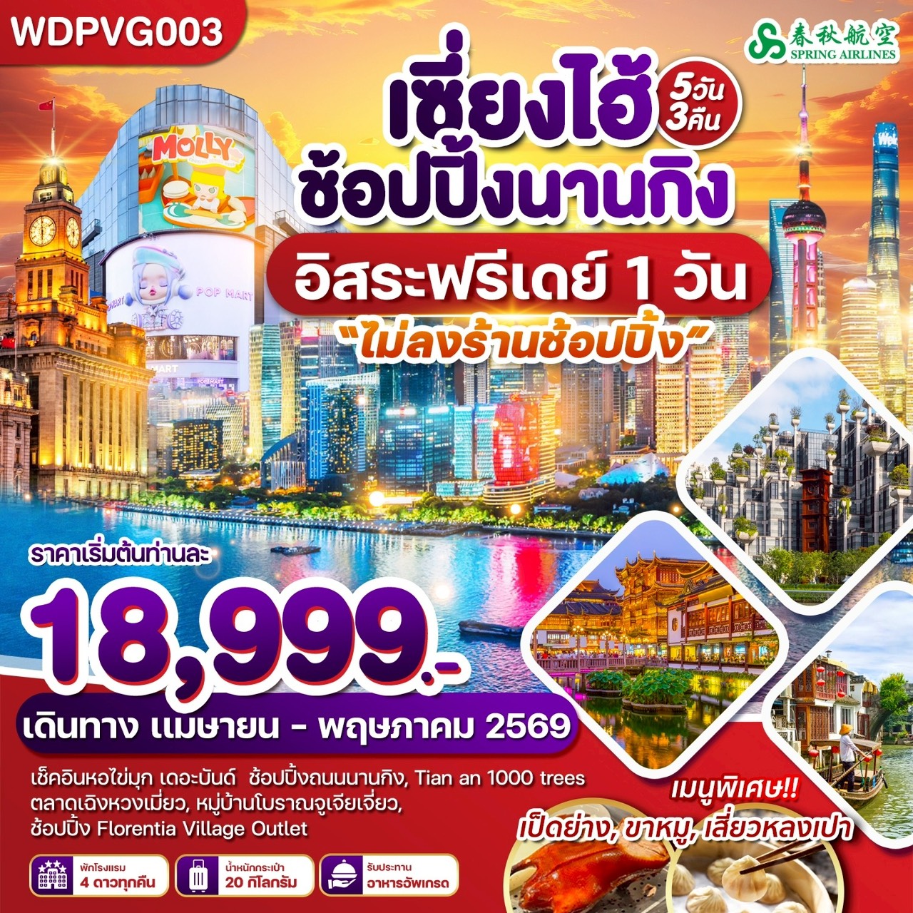 WDPVG001 เซี่ยงไฮ้ ช้อปปิ้งนานกิง *อิสระฟรีเดย์* 5วัน3คืน บิน HO